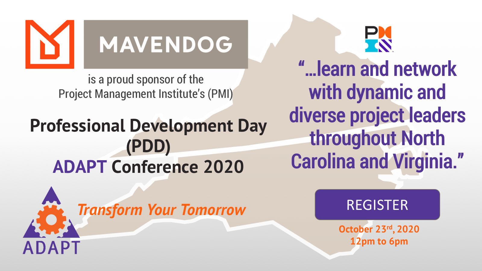 CHARLOTTE, North Carolina — October 29, 2020. On October 23, 2020, for the first time, local NC, SC and VA Project Management Institute (PMI) chapters merged all of their annual Professional Development Day (PDD) Conferences into one, large virtual conference. Mavendog was honored to sponsor and present. The conference (including our local PMI Metrolina chapter) offered eleven sessions in total, all designed to enable participants to uncover new ways to adapt in an ever-changing environment. Each session was aligned to “talent triangle components” — technical, leadership, and strategic or business management. It also provided up to eleven Professional Development Units (PDUs) and rich networking opportunities for its 600 attendees.