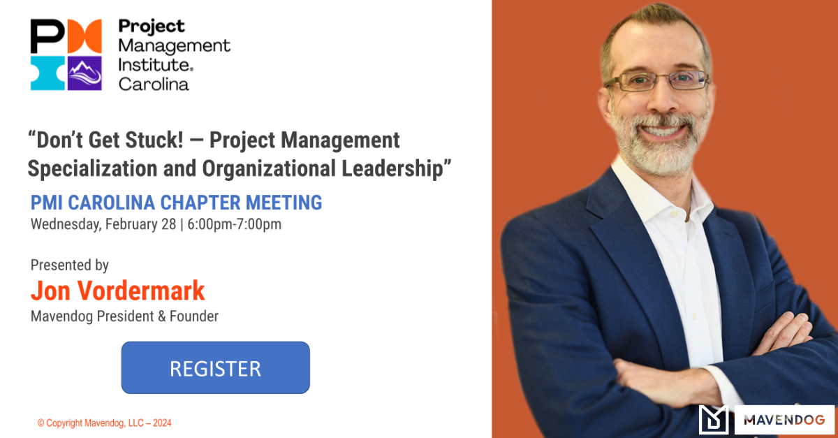 CHARLOTTE, North Carolina — March 1, 2024 — On February 28, 2024, Mavendog’s President Jon Vordermark was invited to present at PMI Carolina Chapter’s Monthly Meeting.