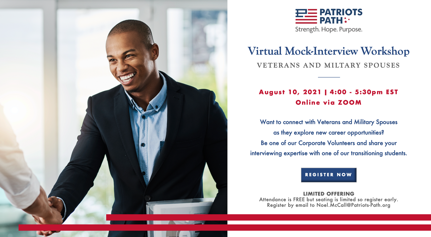 Led by Noël McCall, Patriots Path is a non-profit organization that helps Veterans, transitioning service members, and military spouses find meaningful employment opportunities post-service. In providing career guidance and opportunities for these individuals, Patriots Path is able to connect them with the larger community for continued networking and support.