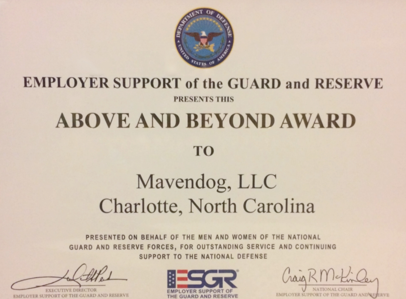 CHARLOTTE, North Carolina — July 21, 2018 — Mavendog, LLC is honored to receive the Above and Beyond Award by the Department of Defense ESGR (Employer Support for the Guard and Reserve) for North Carolina. The Above and Beyond award is presented by ESGR State Committees to recognize employers at the local level who have gone above and beyond the legal requirements of the Uniformed Services Employment and Reemployment Rights Act (USERRA). Mavendog is one of 50 organizations across North Carolina to receive the award this year.