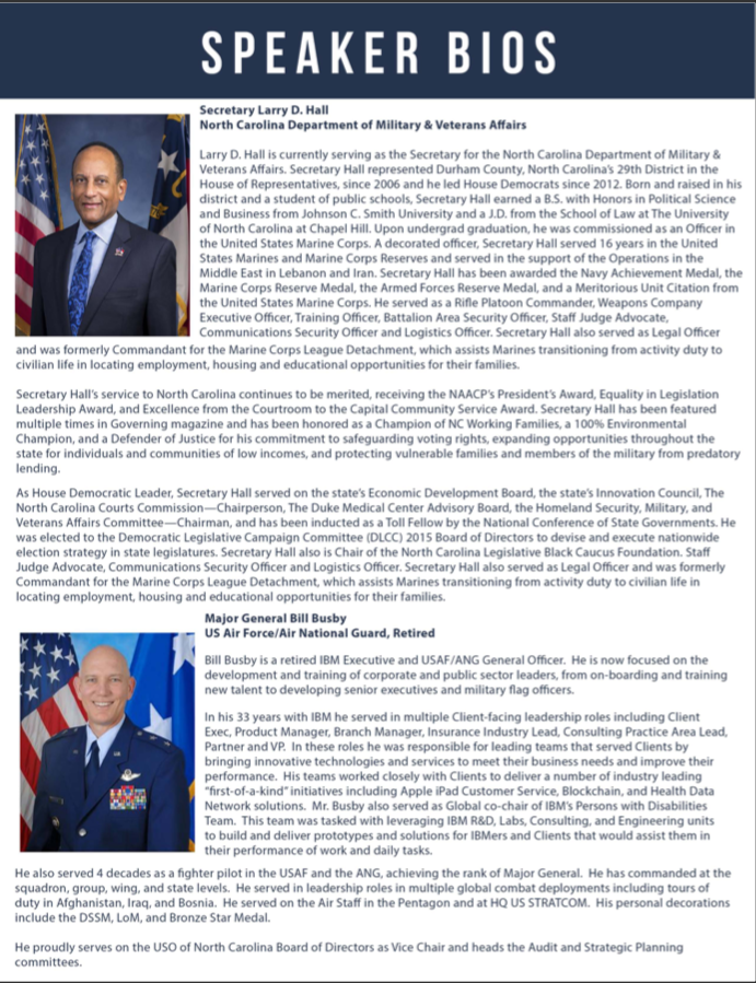 Keynote Speaker Larry Hall, Secretary of the North Carolina Department of Military & Veterans Affairs, passionately spoke about military talent and implementing a military hiring initiative. Additional speakers included Kimberly Williams, founder & CEO of NC4ME, Paul Bill, the Employment Alliance Director at Veterans Bridge Home, and Major General Bill Busby, US Air Force/Air National Guard, Retired. Mr. Busby is also a 33-year IBM vet as a Partner and Vice President, Global Business Services.