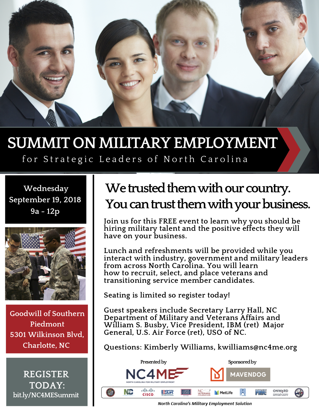 As outlined by NC4ME, the event is designed for senior level leaders from the private and public sectors who are ready to hear what some of NC’s leading employers are doing to support our nation’s military workforce. Attendees walk away with a new understanding of how military talent drives business results, and how to integrate military hiring into their business strategy.