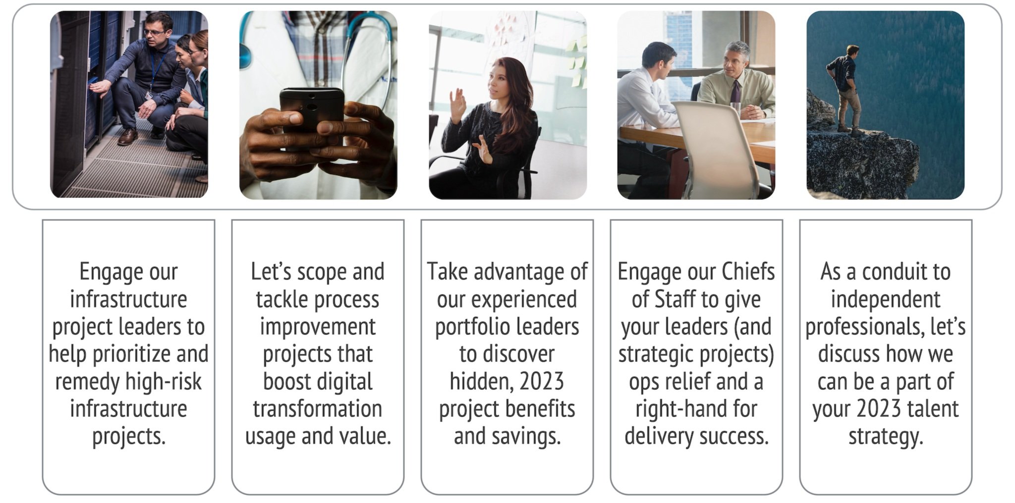 Barriers and reservations aside, with recent talent shortages (especially in IT and supply chain), it seems foolhardy to eschew such a large segment of the US workforce. Companies should consider all resource options in 2023. Moreover, they need to revisit where each resource type is most effective and valuable (whether FTE, staffing, consulting, or independent professionals). For example, in the project management space, projects are an ideal use case for independent professionals, especially for projects that can be scaled in a tactical, short-term, fractional, and cost-savings way.